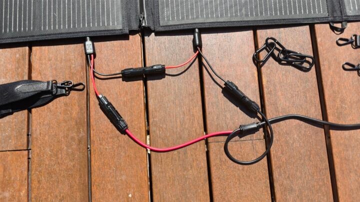 Reading the fine print, I discovered that OptiSolex only recommends a 2m extension cable. In my experience, 5m is the minimum distance to avoid shade and maximise output during the day. This cable must be purchased separately, and I recommend using a heavier gauge cable for longer runs to minimise voltage loss. The MC4 cables built into the panels themselves do work, but again, I would have liked to have seen these a little longer, as they only just reach the extremity of the panel.